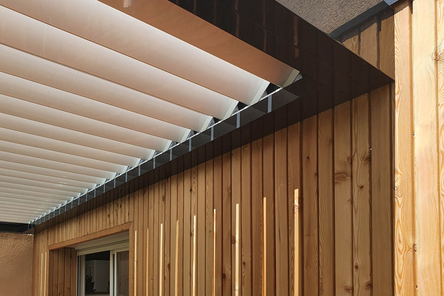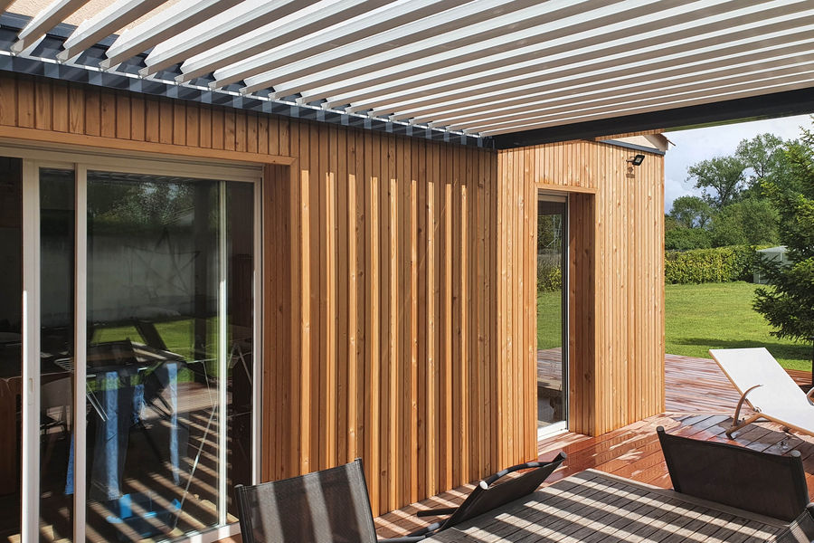 Un mur en maçonnerie est élevé en extérieur pour couper le vent et le bruit de la route vers la terrasse aménagée. Ce mur est recouvert d’un enduit de ton rose clair, similaire à celui de la maison existante. Une pergola bioclimatique est enfin installée pour couvrir la terrasse. Il s’agit d’une pergola mixte constituée de métal et de bois, venant s’appuyer sur la maison existante et sur le nouveau mur maçonné.
