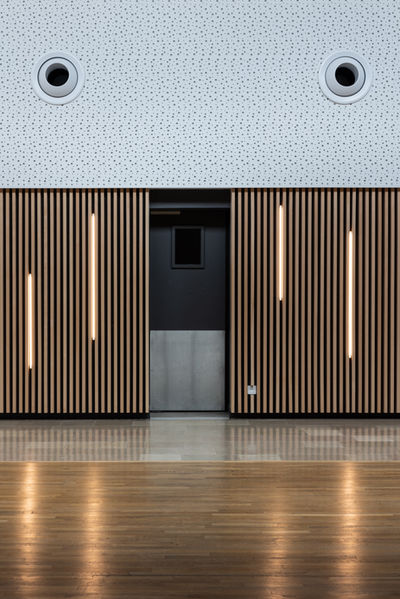 La salle principale fait l’objet d’un traitement acoustique mais aussi esthétique grâce à l’installation d’un habillage en tasseaux de bois et de rideaux. Le parquet et le carrelage d’origine quant à eux sont conservés et rénovés.